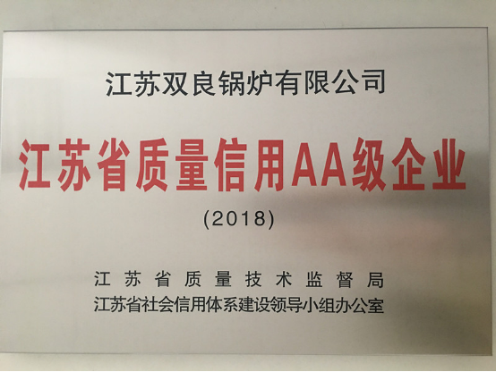 2019年3月18日,江蘇雙良鍋爐有限公司榮獲江蘇省質量技術監督局頒發的“江蘇省質量信用AA級企業”稱號。