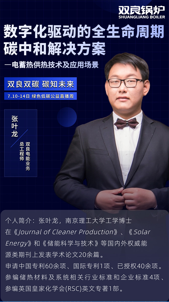 7月11日,雙良鍋爐電能業務部總工程師張葉龍博士,被特邀作了題為“數字化驅動下的全生命周期碳中和解決方案-電蓄熱供熱技術及應用場景”的演講。