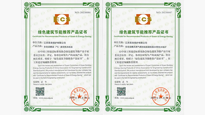 近日,經(jīng)中國工程建設(shè)標準化協(xié)會綠色建筑節(jié)能產(chǎn)品專家委員會審查、評定,江蘇雙良鍋爐有限公司(簡稱“雙良鍋爐”)研發(fā)生產(chǎn)的全自動燃油(氣)真空熱水機組、全自動燃天然氣模塊組裝超低氮水管熱水鍋爐,符合相關(guān)要求,再度被授予“綠色建筑節(jié)能推薦產(chǎn)品證書”,在工程建設(shè)領(lǐng)域推薦使用。